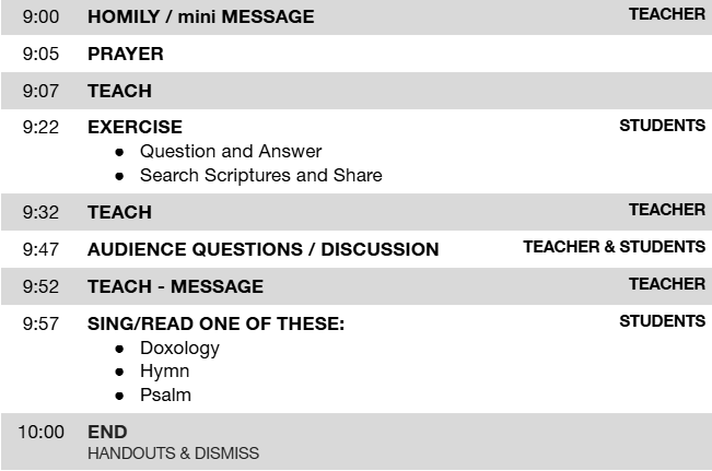 A session is one “class” from a module. Below are some examples of how a session might be structured. There’s a mix of 50% teaching, 25% discussion and exercises, and 25% worship and prayer.